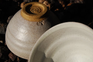 Na tej fotografiji se nahajajo dve sklečki iz gline 592, na katerih sem testirala mojo prvo domačo belo glazuro. Kot sestavine sem uporabila: glinenco, kaolin (aka china clay oz. kitajska glina), kalcit, kremen in dolomit. Tehnika nanosa je bila potapljanje, glazura se lepo prilepi na glino, tako da tudi rokovanje surovih ne zahteva preveč pazljivosti, da bi se glazura odprašila stran. Na maksimalni temperaturi je stabilna in se ne poceja (torej vsebuje dovolj aluminijevih delcev, ki delujejo kot lepilo). Kremen je bil obarvan oranžkasto, kar me je malce skrbelo, no, na visoki temperaturi je lepo postal brezbarven. Kremen v glazuro doprinese steklasto sestavino. Končni rezultat je glazura, ki spominja na bel marmor; semi-transparentna bela s satenastim sijajem! Sijajno!