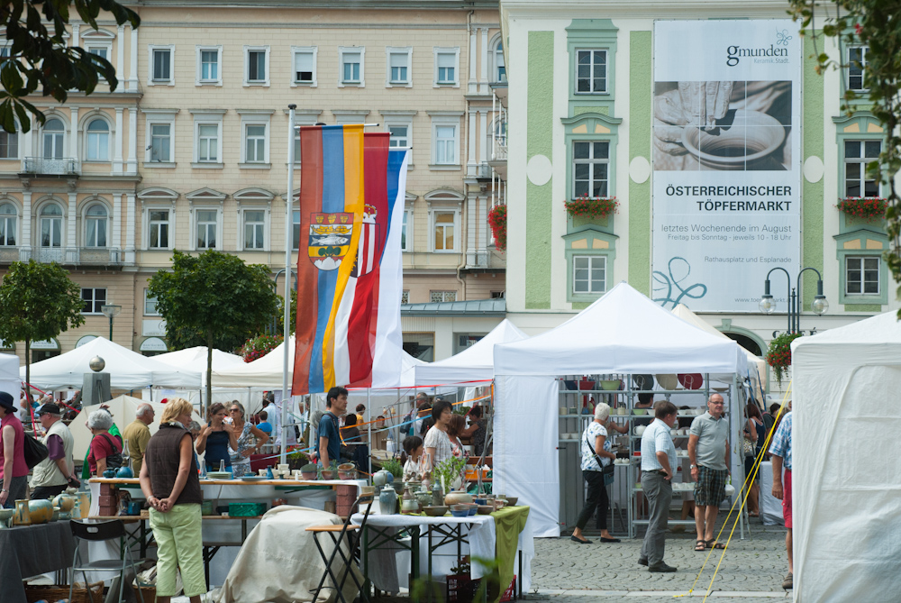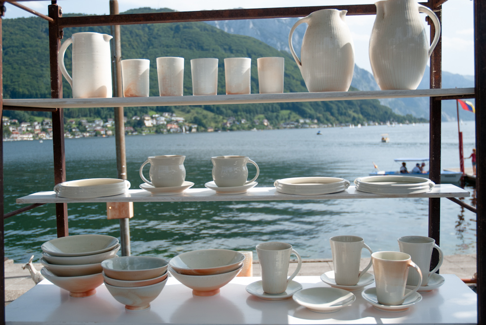 Ko sem lani na spletu zasledila, da je v Avstriji potekal evropski lončarki sejem, sem si v svoj koledarček označila datum letošnjega, kar za eno leto naprej:)  Kljub temu, da se moje življenje trenutno vrti okrog diplomske naloge, pa si nisem morala pomagati, da si ne bi vzela prostega vikenda in šla na izlet! Poleg tega pa sta se lokacija in čas poklopila s še enim dogodkom: svetovnim mladinskim prvenstvom v raftingu na Češkem, kjer je bil v slovenski reprezentanci dečkov tudi moj bratranec <3 Pot na Češko je torej potekala z zavojem čez čudovit (čeprav vem le, kako zgleda glavni trg:) Gmunden, majhno lončarsko mestece ob jezeru Traumsee na severu Avstrije, kjer je potekal 24. avstrijski lončarski sejem. V Gmundnu smo šli najprej na kosilo v restavracijo, ki je imela takšen razgled...