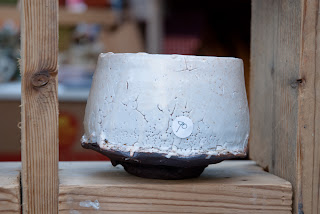 Tale gospa na fotografiji pa izdeluje wood-fired kamenine, tudi s shino glazurami. Shino chawana sem si privoščila tudi sama. Imel je precej visoko ceno, vendar je res top! Fotke naslednjič z obrazlago shino-ta- Na fotografiji pa je gospa skupaj z moževo keramiko, ki je specializirana za kristalin glazure (kjer se v procesu žganja tvorijo pravi kristali, npr. titanovi):