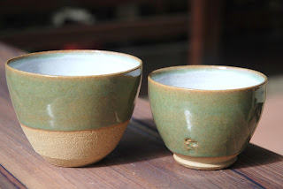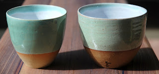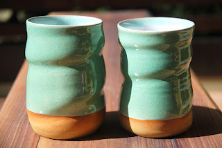 Kar nekaj novih skodelic je nastalo v zadnjih nekaj tednih. V njih se neposredno izraža moje počutje: ki je brezskrbno in brez temnih oblakov nad mano (če prevedem: nimam več diplome na skrbi). Največ sem ustvarjala skodelice brez ročk; sem ugotovila, da so ročke takooo dolgočasne za pritrjevanje:) Ročke potrebujejo navdih. Glina, ki sem jo uporabila je zelo mešana: od bele šamotirane do rdeče, oziroma vsi odtenki vmes, saj sem jih sproti mešala in gnetla, kateri koli kosi in ostanki so mi prišli pod roke, tudi stopiško in mirnško sem ponekod vmešala. Pri tem se je izkazalo, da so različni peščeno-rjavi odtenki zelo fajn. Če sestavim skupaj parček, je ena skodelica za odtenek drugačna od druge:) Opisi pa so podani v galeriji na moji spletni strani.