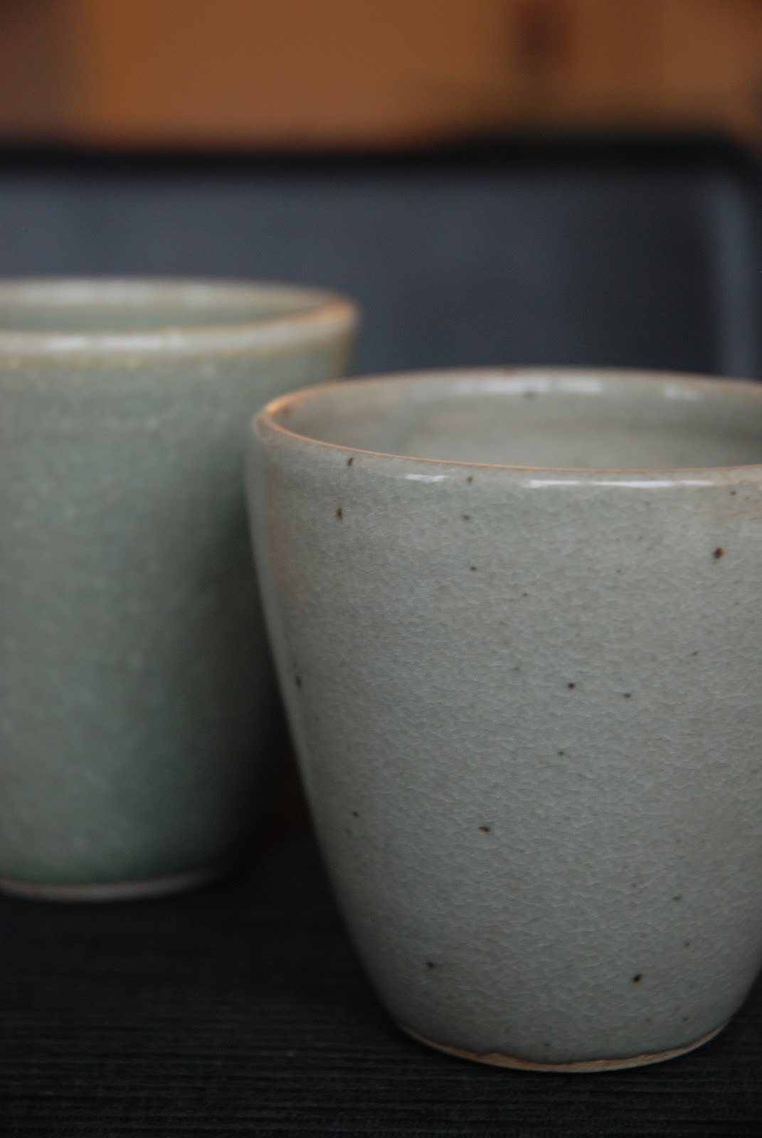 I still haven’t settled in. I am trying to build my studio as soon as possible. I have two spare rooms in the apartment; one is on the rooftop. It is a very small room but it has 3 window walls. I wanted to be in the warmer room below, but the light does it’s magic and when the sun shines it is so bright that the tiny room becomes a spacious warm bubble with the nicest view. I brought my Shimpo wheel with me, I only have to protect the floor and walls against dirty clay work. I hope I can start the wheel tomorrow, I had a long break.. I am full of new inspiration. I already found a small store with clay one street away and on the same street I always look trough the window of a one studio. It has no name but I can see the wheel, the kiln and some molds and on the walls there are few large plates hanging with bright and colorful crystalline glazes. And if I type keramiek Amsterdam to Google I get 4 matches only in my area. I also visited Ceramics center Netherlands Keramikos in Haarlem on the outskirts of Amsterdam, which is like a huge hall where they sell everything a potter could imagine. I was there quite a while but only bought one pack of their clay, because I couldn’t carry more. I am now making my wish list for ordering. And last Saturday I visited a Amsterdam ceramist Marjoke De Heer. I am drinking water out of her cup right now. I bought two. She is a specialist in celadon glaze fired in reduction. She is a very nice person and she offered us a tour trough her gallery even though she had a broken leg. She had the most beautiful gallery I have ever seen. So elegant and with all the lights carefully placed in all the right spots. Maybe I also think that way because I really liked her ceramics. She mostly does celadon, which means that the shelves are in subtle greyish green color, typical for celadon.